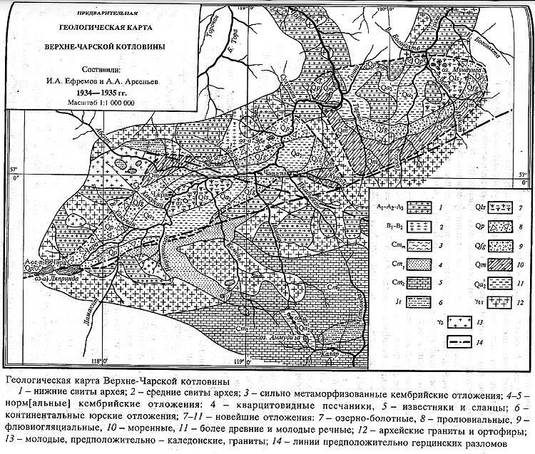 В строении всей площади Верхне-Чарской и Верхне-Токкинской котловин принимают участие отложения только трех геологических формаций - архея, кембрия и юры. Древнейшие свиты повсюду вскрыты непосредственно на дневной поверхности и только в значительных отрицательных элементах рельефа - котловинах - скрываются под незначительной мощности покровом четвертичных и современный рыхлых отложений.